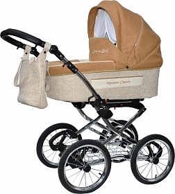 размер (д/ш/г) 82х40х25, деревянное донышко, регулируемый подголовник: 3 положения, функция колыбели, теплый меховой конверт, накидка на ноги, вместительная сумка, дождевик, противомоскитная сетка, вес (люлька + рама) 14,5 кг